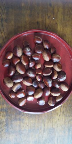 数日かけて これだけの栗がまとまりました。虫が入っているものがあるので、一旦水に漬けて沈んでいるものを選びます。(浮いているものは虫が入っているので、捨てます)